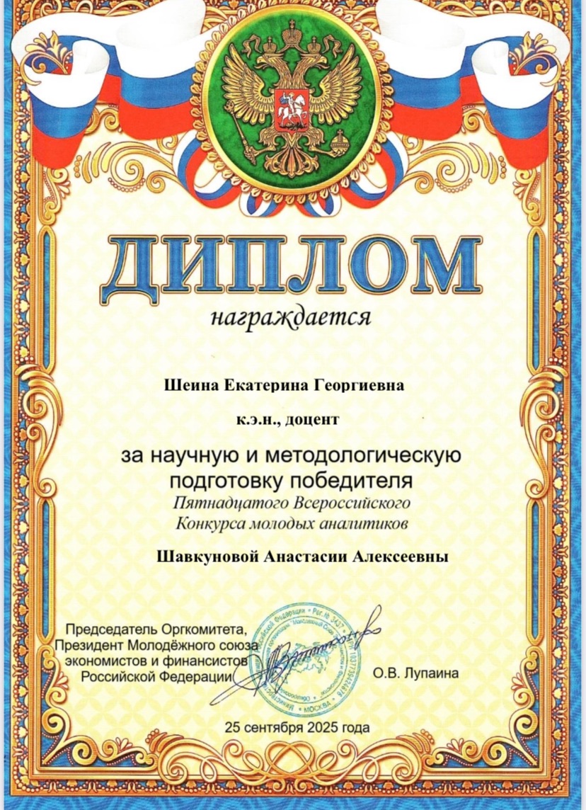 Также Анастасия стала победителем XV Всероссийского конкурса молодых аналитиков , организованного Молодежным союзом экономистов и финансистов РФ (МСЭФ), с научной работой на тему: «Оценка стратегического и проектного управления малым предпринимательством в России».